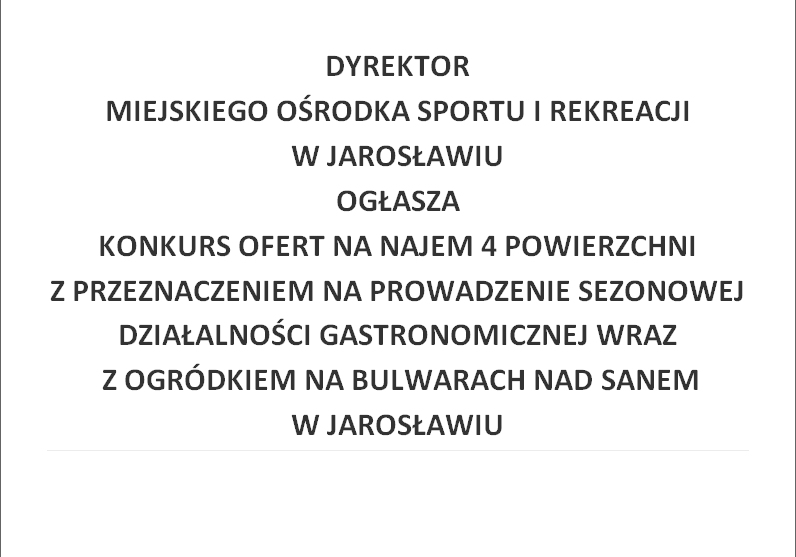 16 marca 2026OGŁOSZENIE O KONKURSIE NA NAJEM POWIERZCHNI NA BULWARACH NAD SANEMDyrektor Miejskiego Ośrodka Sportu i Rekreacji w Jarosławiu ogłasza konkurs ofert na najem 4 powierzchni z przeznaczeniem na prowadzenie sezonowej działalności gastronomicznej wraz z ogródkiem na Bulwarach nad Sanem w Jarosławiu.
