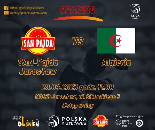 Na ostatnie w tym sezonie siatkarskie emocje ZAPRASZAMY w sobotę 29 kwietnia. SAN-PAJDA JAROSŁAW rozegra sparingowe spotkanie z ALGIERIĄ. Początek spotkania o godz. 11.00 w Hali MOSiR. WSTĘP WOLNY!